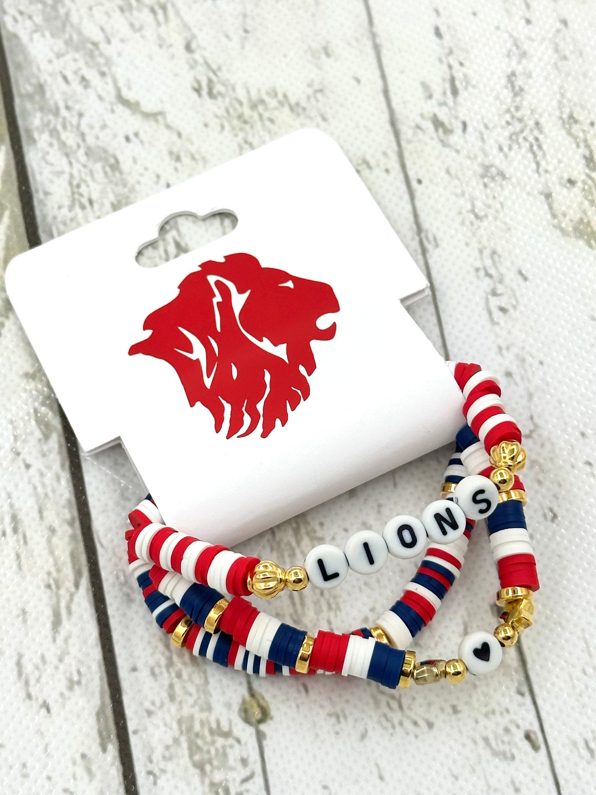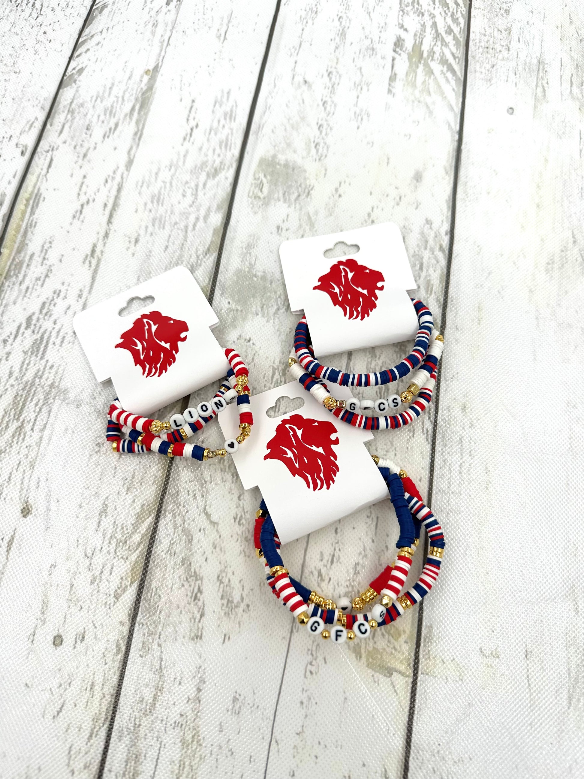 Show your Lion spirit with these triple stacked clay bead bracelets! Available in 3 different sizes: 6in, 7in and 8in. These are assorted styles and vary in bead words as well as color patterns…Go Lions, Faith Lions, GFCS, etc.